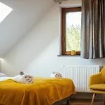 El diseño interior viene con un sofá y un escritorio, así como internet de alta velocidad y TV de pantalla plana con canales vía satélite. Dom Letniskowy Insko Vip Villa ofrece una ducha a ras de suelo, un inodoro separado y una bañera, además de comodidades como secador de pelo y toallas.